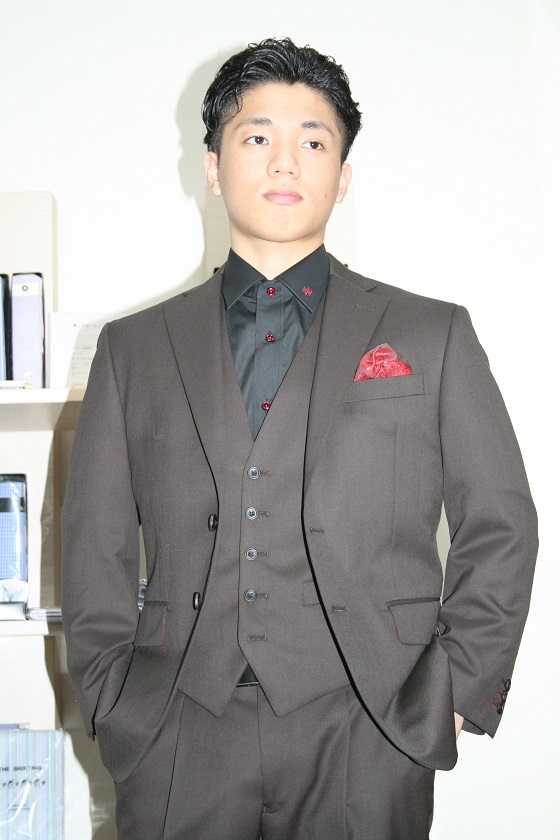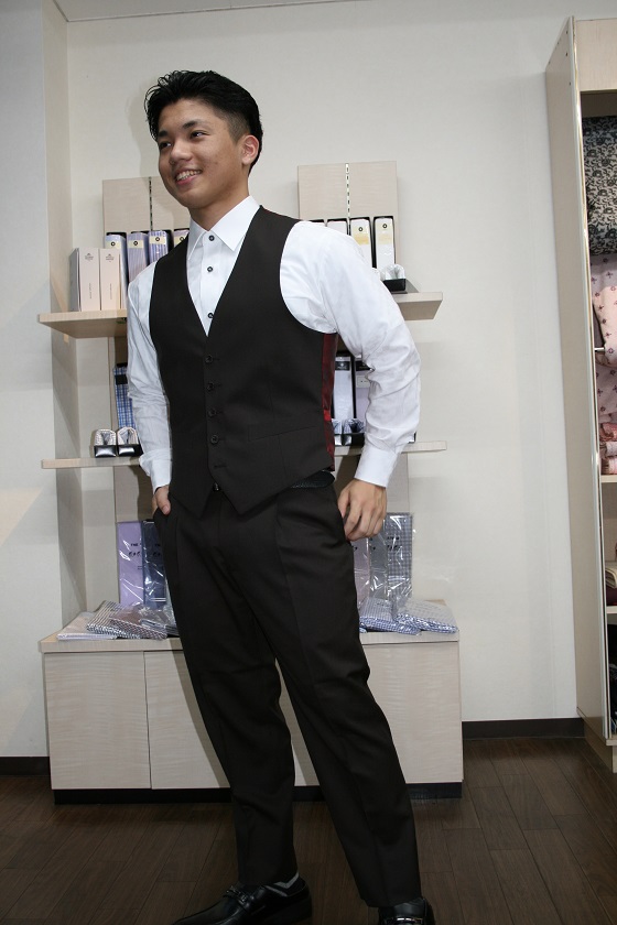 来年の成人式に向けて、深いブラウンのスリーピーススーツとシャツをお仕立て下さいましたM様です。