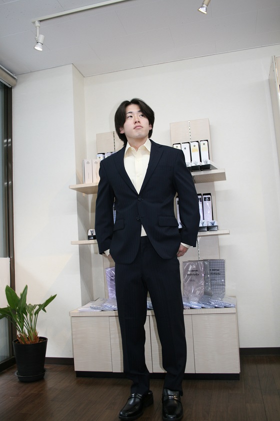 春の卒業式と入社式に向け、紺のシャドウストライプのスーツをお仕立て下さいましたK様です。